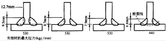 母材金屬高,對于尺寸為8.7mm和8mm的角焊縫也是這樣。當(dāng)角焊縫尺寸減小到6.4mm時(shí),焊縫金屬在220kgf/mm壓力(該壓力值是美國焊接學(xué)會施用壓力的5倍多)