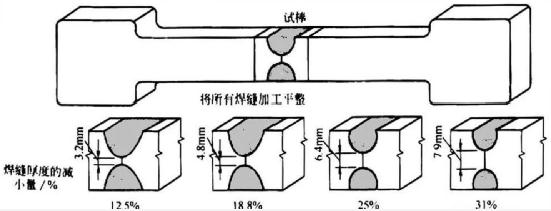 ③圖3給出了未焊透對焊縫強(qiáng)度的影響。進(jìn)行拉伸試驗(yàn)之前,先將焊縫加工平整。當(dāng)焊縫縮頸處減小到整個(gè)試樣厚度的31%時(shí),整個(gè)焊縫才發(fā)生破斷.