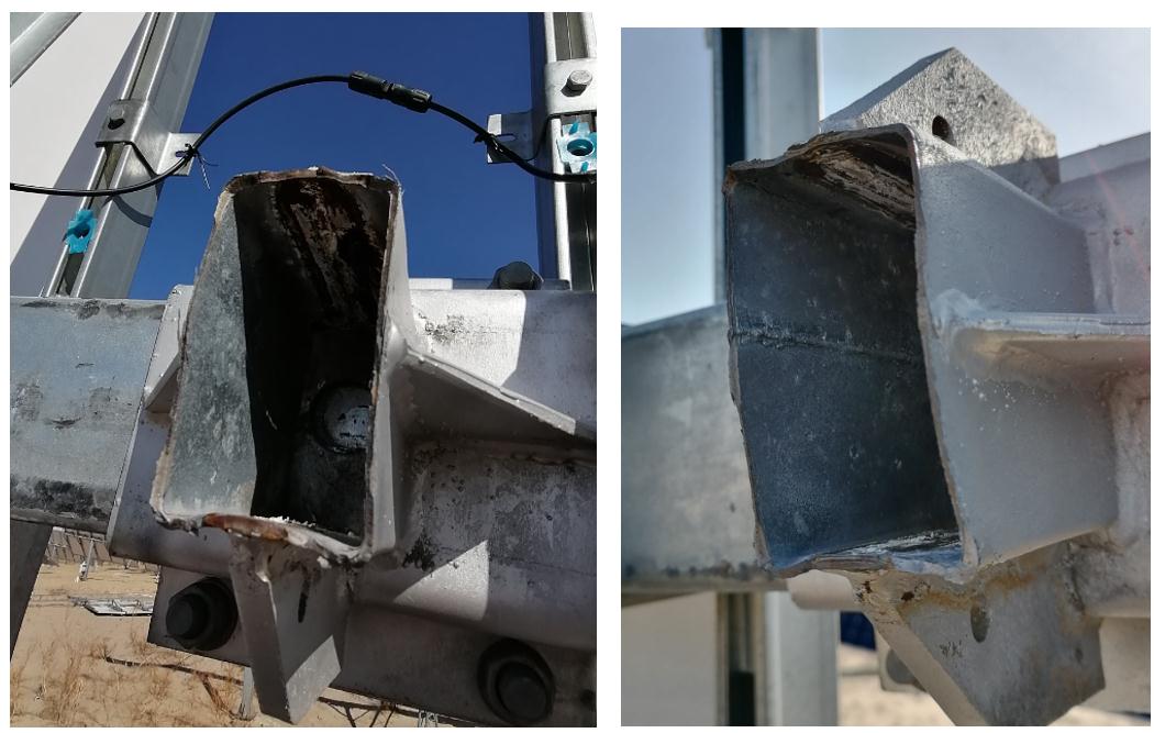 斜單軸跟蹤系統(tǒng)的各部件均出現(xiàn)不同程度的損壞,其中作為主支撐結構的方鋼管主梁發(fā)生屈曲斷裂直接導致支架倒塌,因此造成的損壞最大。